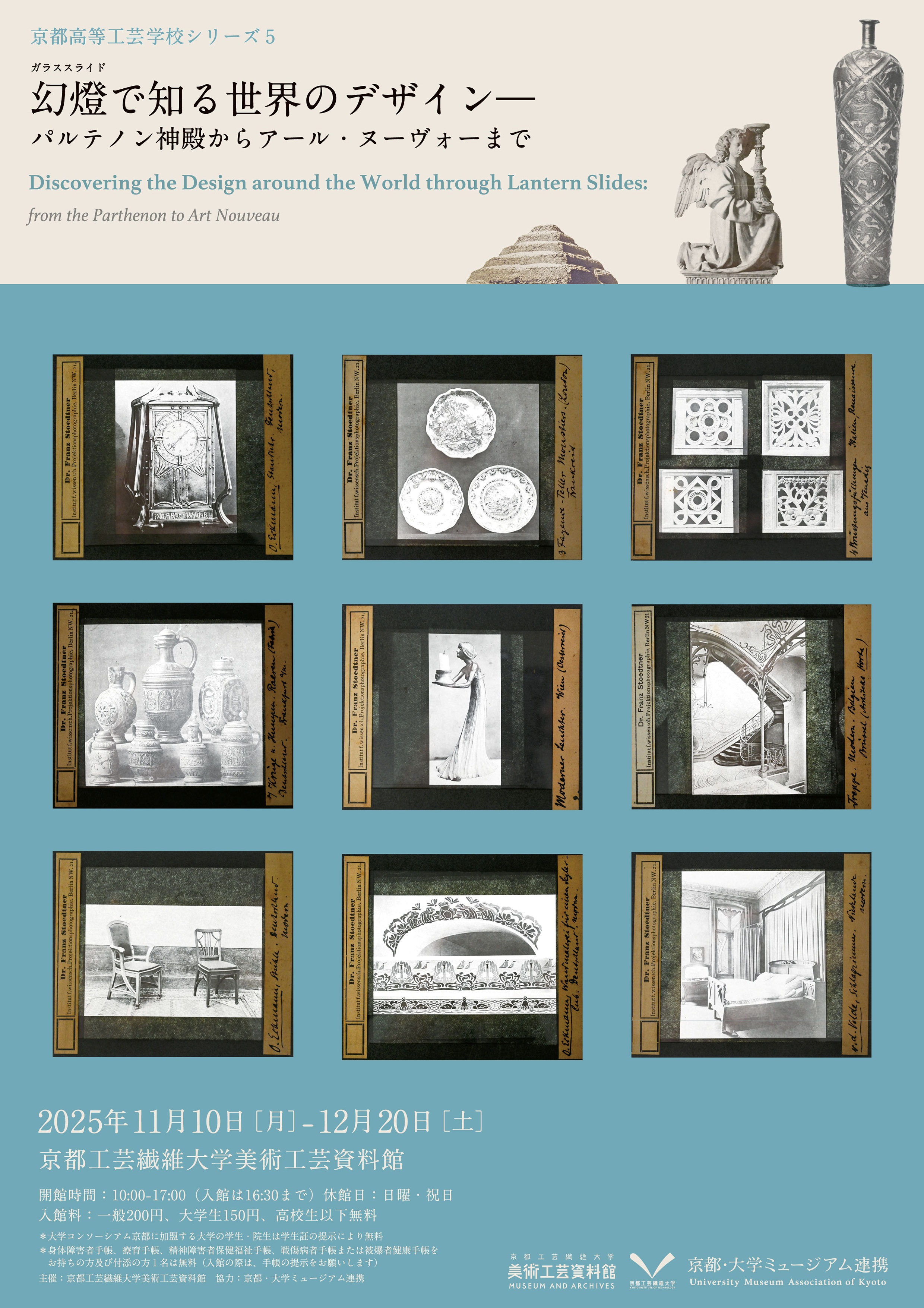 本展では、京都高等工芸学校において開校初10年に収集された海外製のスライドの一端を当時の教材とともに公開します。古代ギリシャ・ローマの美術から同時代のアール・ヌーヴォーまで、初代校長の中澤岩太(1858-1943)をはじめ、浅井忠(1856-1907)や武田五一(1872-1938)ら教員たちが20世紀初頭のヨーロッパで何をまなび、何を生徒と共有しようとしたのか、その高精細な画像の美しさとともにお楽しみください。